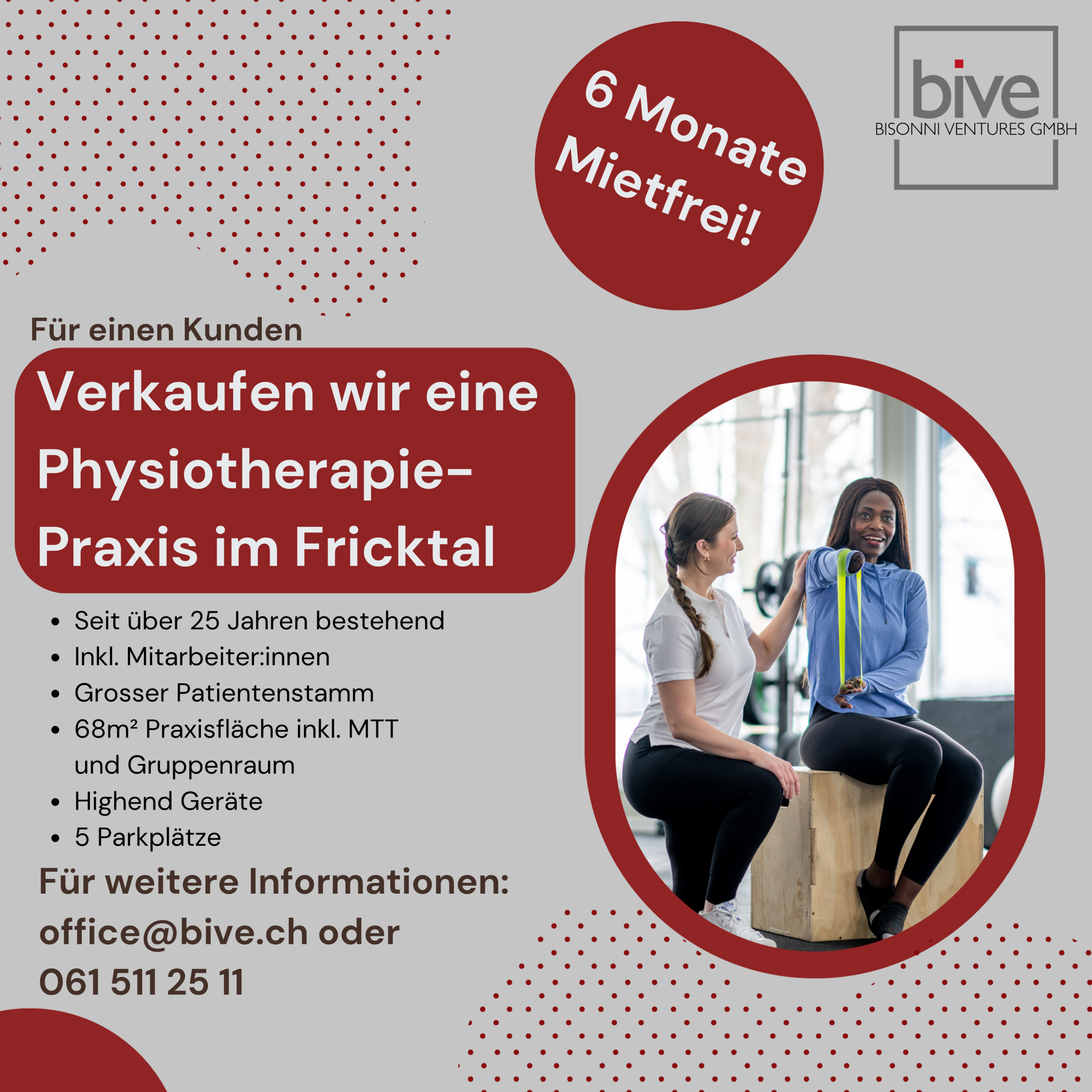 Im Auftrag unserer Kundin verkaufen wir eine langjährig etablierte Physiotherapiepraxis im Fricktal (Kanton Aargau).